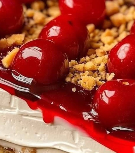 As soon as the vanilla wafer crust has cooled, spread it evenly with the cream cheese mixture. The cherry pie filling should be distributed evenly over the top.