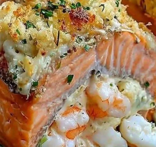 There are dishes we cook to feed ourselves, and there are dishes we cook to celebrate—to mark moments, to show love, to create memories. This salmon stuffed with creamy crab and shrimp filling belongs in that second category. It’s not just dinner, it’s an experience: luxurious, satisfying, and unforgettable.