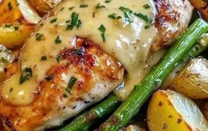 This honey mustard chicken recipe is a restaurant-worthy dish made with just a few simple ingredients. It’s paired with crispy roasted potatoes and tender asparagus, all smothered in a creamy Dijon sauce that’s both tangy and sweet. Perfect for an elegant dinner or a cozy weekend meal. Ingredients4 boneless, skinless chicken breasts4 tablespoons honey3 tablespoons Dijon mustardADVERTISEMENT2 cloves garlic, minced500g fresh asparagus (about 1 bunch)4 medium potatoes, cubed2 tablespoons olive oilSalt and black pepper, to tasteADVERTISEMENTFresh herbs (chives or parsley), optional for garnishGrated cheese (optional – sprinkle over potatoes before baking)InstructionsPreheat oven to 400°F (200°C).In a small bowl, mix together honey, Dijon mustard, and minced garlic.Season chicken breasts with salt and pepper. Set aside.ADVERTISEMENTToss cubed potatoes in olive oil, salt, and pepper. Spread on a baking sheet and roast for 20 minutes.While potatoes are roasting, heat a skillet over medium-high heat.Sear chicken breasts for 2–3 minutes per side until golden.Remove chicken from heat and brush generously with the honey mustard mixture.Add asparagus to the baking tray with potatoes. Place the seared chicken on top.Roast everything together in the oven for 15–20 more minutes, until chicken is fully cooked and potatoes are crispy.ADVERTISEMENTDrizzle remaining honey mustard sauce over the chicken.Garnish with fresh herbs and serve hot.Time & NutritionPrep Time: 10 minutesCook Time: 35–40 minutesTotal Time: ~50 minutesServings: 4Calories: ~420 kcal per serving (without cheese)Serving SuggestionsServe with crusty bread, rice pilaf, or a side salad.Add grated Parmesan or cheddar over potatoes for a cheesier twist.ADVERTISEMENTLeftovers work great in wraps or lunch bowls the next day.Enjoy!