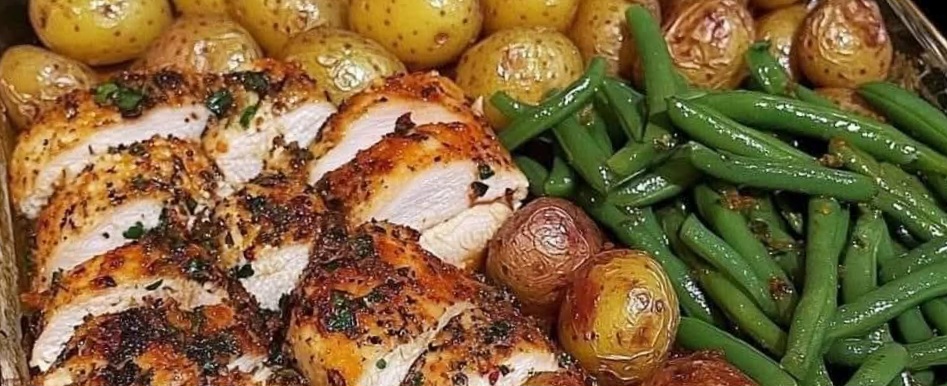 One-Pan Garlic Herb Chicken with Potatoes & Green BeansPrep Time: 15 minutesCook Time: 45 minutesServings: 4Calories: ~400 per servingIngredientsFor the Chicken4 boneless, skinless chicken breasts2 tbsp olive oil2 tsp garlic powder1 tsp dried oregano1 tsp paprikaSalt & black pepper to tasteFor the Vegetables3 cups baby potatoes (quartered)2 cups fresh green beans2 tbsp olive oil2 garlic cloves (minced)1 tsp dried thyme1 tsp smoked paprikaSalt & pepper to tasteFor the Sauce1/4 cup chicken brothJuice of 1 lemon1 tbsp Dijon mustardInstructions: