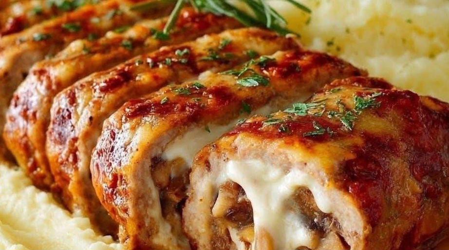 Of course. Here is a detailed recipe for a spectacular Baked Stuffed Meat Roll with Mushroom Mashed Potatoes.This recipe creates an impressive, restaurant-quality meal that’s perfect for a special Sunday dinner or holiday gathering. The key is in the layers of flavor, from the savory meat roll to the rich, earthy mashed potatoes.Baked Stuffed Meat Roll with Mushroom Mashed PotatoesThis recipe serves 6-8 people.PART 1: THE MUSHROOM MASHED POTATOESIngredients:2 lbs Yukon Gold or Russet potatoes, peeled and quartered½ cup (1 stick) butter, divided1 small shallot, finely minced2 cloves garlic, minced8 oz cremini or baby bella mushrooms, finely chopped½ cup heavy cream or whole milk, warmed½ cup sour creamSalt and freshly ground black pepper to taste1 tbsp fresh thyme leaves (or 1 tsp dried)Instructions:Cook Potatoes: Place the peeled, quartered potatoes in a large pot of cold, salted water. Bring to a boil and cook for 15-20 minutes, or until very tender when pierced with a fork.Sauté Mushrooms: While potatoes cook, melt 4 tablespoons (half a stick) of butter in a large skillet over medium heat. Add the shallot and cook until softened (2-3 mins). Add garlic and cook for 30 seconds until fragrant.Add the chopped mushrooms and thyme. Cook, stirring occasionally, until the mushrooms have released their liquid and it has evaporated, and the mushrooms are deeply browned (about 8-10 minutes). Season generously with salt and pepper. Set aside.Mash: Drain the potatoes thoroughly and return them to the hot pot for a minute to let any residual moisture evaporate. Mash them well.Add the remaining 4 tbsp of butter, warm heavy cream, and sour cream. Mash or whip until smooth and creamy.Fold in the cooked mushroom mixture until fully incorporated. Taste and adjust seasoning. Cover and set aside (you can keep them warm in a low-temperature oven if needed).PART 2: THE STUFFED MEAT ROLLIngredients for the Meat Mixture:2 lbs ground meat blend (e.g., 1 lb ground beef (80/20) + 1 lb ground pork)1 cup panko breadcrumbs2 large eggs, lightly beaten½ cup whole milk1 small onion, very finely grated or minced3 cloves garlic, minced2 tbsp Worcestershire sauce1 tbsp Dijon mustard2 tsp fresh parsley, chopped1 ½ tsp salt1 tsp black pepper½ tsp smoked paprikaIngredients for the Stuffing:6-8 slices thin-cut prosciutto, ham, or bacon6-8 slices Swiss, Provolone, or Gruyère cheese2 cups fresh spinach leaves1 tbsp olive oil1 clove garlic, minced (optional for spinach)For Cooking:2 tbsp olive oil½ cup beef or chicken brothInstructions:Prepare Filling: Heat 1 tbsp olive oil in a skillet. Add spinach (and optional garlic) and sauté just until wilted (1-2 minutes). Remove from heat and set aside.Make Meat Mixture: In a large bowl, combine the panko and milk. Let it sit for 2 minutes to absorb. Add all remaining meat mixture ingredients (ground meats, eggs, onion, garlic, Worcestershire, mustard, and seasonings). Use your hands to mix just until combined; do not overwork.Form the Roll:On a large piece of parchment paper or plastic wrap, press the meat mixture into a roughly 10″x14″ rectangle, about ½-inch thick.Layer the prosciutto/ham evenly over the meat, leaving a 1-inch border on all sides.Layer the cheese slices over the prosciutto.Spread the wilted spinach evenly over the cheese.Roll It Up: Using the parchment paper to help you, tightly roll the meat into a log, starting from the short end. Press to seal the ends and the final seam. Ensure the roll is tight and even.Chill: Carefully transfer the roll, seam-side down, to a baking sheet or plate. Refrigerate for at least 30 minutes (or up to 4 hours). This is critical—it helps the roll hold its shape while baking.Bake: Preheat oven to 375°F (190°C). Heat 2 tbsp olive oil in a large, oven-proof skillet or Dutch oven over medium-high heat. Carefully sear the meat roll on all sides until a brown crust forms, about 2-3 minutes per side.Finish in Oven: Pour the broth into the skillet around the roll (not over it). Transfer the entire skillet to the preheated oven. Bake, uncovered, for 45-55 minutes, or until the internal temperature reaches 160°F (71°C).Rest: Remove the skillet from the oven. Carefully transfer the meat roll to a cutting board and let it rest for 10-15 minutes. This allows the juices to redistribute, making it easier to slice.