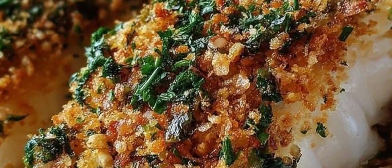 Baked Cod with Garlic Herb Crumb Topping RecipeThis baked cod with a crispy garlic herb crumb topping is a flavorful and easy-to-make dish. Perfect for a quick weeknight dinner or a special occasion, this recipe combines the delicate, flaky texture of cod with a savory, crunchy topping. It’s naturally gluten-free if you use gluten-free breadcrumbs.Ingredients:4 cod fillets (about 4-6 oz each)1 cup gluten-free breadcrumbs (or regular if not gluten-sensitive)2 tbsp olive oil2 tbsp melted butter2 garlic cloves, minced1 tbsp fresh parsley, chopped1 tbsp fresh thyme, chopped (or 1 tsp dried thyme)1/2 tsp paprikaSalt and pepper to taste1 lemon, thinly sliced (for garnish)2 medium potatoes, thinly sliced (optional, for a side)Instructions:Preheat the Oven: Preheat your oven to 400°F (200°C).Prepare the Topping: In a small bowl, combine the gluten-free breadcrumbs, olive oil, melted butter, minced garlic, chopped parsley, chopped thyme, paprika, salt, and pepper. Mix until the breadcrumbs are evenly coated with the oil and butter.Prepare the Cod: Arrange the cod fillets on a baking sheet or in a baking dish. Season with salt and pepper. If you like, you can lightly drizzle some olive oil over the fish for extra moisture.Assemble: Spread the breadcrumb mixture evenly over each cod fillet, pressing it gently to ensure it sticks. If you’re adding sliced potatoes as a side, scatter them around the fish on the baking sheet, drizzling with a bit of olive oil, salt, and pepper.Bake: Bake in the preheated oven for 15-20 minutes, or until the fish flakes easily with a fork and the topping is golden and crispy. If you’re cooking potatoes, they may need a few extra minutes to become tender.Serve: Serve the baked cod with lemon slices and garnish with extra chopped parsley. The crispy breadcrumb topping pairs beautifully with the soft, flaky fish and roasted potatoes.Tips:For Extra Flavor: Add a squeeze of lemon juice over the fish just before serving to brighten the dish.Make it a Complete Meal: Serve with roasted vegetables or a simple green salad for a well-rounded meal.Crispier Topping: For a crispier topping, broil the fish for the last 2-3 minutes of cooking, watching carefully to avoid burning.Enjoy your delicious and crispy baked cod with a garlic herb crumb topping!