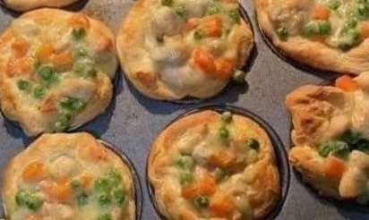 Ingredients14 ounces Cream of Chicken Soup¼ cup Chicken Stock3 packages Crescent Rolls(you will have to seal the seams)9 ounces frozen mixed vegetables, thawed1 cup chicken, shreddedPreparationPreheat the oven to 400* Spray muffin tins with a non stick spray Lay the crescent roll dough out flat, pinch seams together Using a biscuit cutter, cut out 12 rounds from the dough Press the dough into the muffin tins, including up the sides In a large bowl, mix together the soup, thawed vegetables and the shredded chicken Spoon the filling into each muffin cup, do not overfill Using a pizza cutter, slice strips of dough and lay across the tops of the muffin cups Place in the oven and bake for about 18 minutes, until the top and sides are a light golden brown. If the top begins to brown too quickly, cover with aluminum foil and bake Let cool and use a knife to loosen from the muffin tins.Enjoy !
