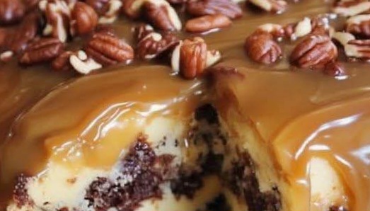 Adecadent, layered dessert that combines rich chocolate, buttery caramel, crunchy pecans, and a moist German chocolate cake base—this 9×13-inch treat is pure indulgence in every bite. Inspired by classic turtle candies, this easy bake delivers all the flavors you love: gooey, nutty, chocolatey, and utterly irresistible.Why You’ll Love This RecipeThis isn’t just a sheet cake—it’s a candy bar reborn as dessert. With a soft German chocolate crumb, a molten layer of warm caramel and toasted pecans, and a final drizzle of chocolate frosting, it’s like eating a homemade turtle candy with a fork. The best part? It starts with a cake mix for speed and ease, but tastes like you spent hours baking.Perfect for:Holiday desserts (Christmas, Easter, birthdays)Potlucks and family gatheringsMake-ahead treatsGifting or sharing with neighbors “I brought this to my book club,” said one home cook. “They asked if I’d been baking all day—but it took less than 10 minutes to mix!” IngredientsFor the Caramel-Pecan Layer1 (11 oz / 312g) bag caramel bits (like Kraft or Werther’s)¾ cup (1½ sticks / 170g) unsalted sweet cream butter, melted½ cup (120ml) evaporated milk2 cups (200g) chopped pecans, lightly toasted (see tip below)1 cup (175g) semi-sweet chocolate chipsFor the Cake1 (18.25 oz) box German chocolate cake mix (any brand)3 large eggs, room temperature⅓ cup (80ml) canola oil (or vegetable oil)1 cup (240ml) whole milkFor the Finish1 container (about 16 oz) chocolate fudge frostingExtra chocolate chips and chopped pecans, for topping (optional)Step-by-Step Instructions1. Preheat & PrepPreheat oven to 350°F (175°C).Lightly grease a 9×13-inch baking dish with nonstick cooking spray—no need to flour.2. Make the Cake BatterIn a large bowl:Combine cake mix, eggs, oil, and milk.Beat with a hand mixer on medium speed 1–2 minutes, until smooth and well blended. No lumps? Scrape down the bowl halfway through. 3. Bake the First LayerPour half of the batter into the prepared pan and spread evenly.Bake 15 minutes, until set but not fully cooked.Remove from oven—leave oven on.4. Make the Turtle FillingWhile cake bakes:In a saucepan over medium heat:Combine caramel bits, evaporated milk, and melted butter.Stir constantly 3–5 minutes, until smooth, creamy, and fully melted.Remove from heat.Stir in pecans and 1 cup chocolate chips.5. Assemble the LayersCarefully pour the warm caramel-pecan mixture over the partially baked cake layer.Spread gently with a spatula—work quickly before it sets.Pour the remaining cake batter over the top and carefully spread to cover completely.6. Final BakeReturn to oven and bake 20–25 minutes, until:Top is golden brownA toothpick inserted near the edge comes out clean Do not overbake—the center may look soft, but it firms up as it cools. 7. Cool & FrostLet cool completely in the pan on a wire rack (~2 hours).Once cool, spread the chocolate fudge frosting evenly over the top. Pro Tip: Let frosting sit at room temp 15 mins to soften—or microwave 10 seconds for easy spreading. 8. Garnish & ServeSprinkle with extra chocolate chips and chopped pecans for bakery-style flair.Slice and serve at room temperature. Optional finish: Drizzle with extra caramel sauce before serving. You Must KnowToast the pecans first —spread on a tray and bake at 350°F for 6–8 mins until fragrant. Deepens flavor!Don’t skip cooling —warm cake melts the frosting and makes it runny.Use real evaporated milk —not sweetened condensed milk (that’s for dulce de leche!).Tastes better the next day! Flavors meld beautifully overnight.Storage TipsStore covered at room temperature for up to 2 days, or refrigerate for up to 5 days.Reheat individual slices in microwave (10–15 seconds) for warm, gooey texture.Freeze for up to 3 months —wrap tightly and thaw overnight before serving.Ingredient SubstitutionsGerman chocolate mixDevil’s food or chocolate cake mixFor deeper chocolate flavorCaramel bitsSoft caramels (unwrapped) + 2 tbsp milkMelt together slowlyPecansWalnuts or almondsFor different crunchEvaporated milkRegular milk (less rich)Avoid water or substitutesChocolate frostingHomemade ganache or whipped chocolateUpgrade optionServing SuggestionsServe with vanilla ice cream or whipped cream.Great for dessert tables, baby showers, or weekend brunches.Double the batch and gift one to a neighbor.Cultural ContextInspired by Southern candy traditions and American sheet cakes, this recipe honors the beloved “turtle” candy—chocolate, caramel, and pecans—by turning it into a shareable dessert. Found at church basements, holiday tables, and potluck lines alike, it proves that great food doesn’t have to be fancy—just full of heart, heat, and sweetness.Pro TipsDouble the recipe? Yes—perfect for large gatherings.Want more caramel flavor? Add ½ tsp sea salt to the caramel layer for salted caramel twist.Make ahead: Bake cake 1–2 days ahead. Frost and garnish before serving.Label your dish: People will ask for the recipe.Say “ready?” before slicing —it’s part of the ritual.Frequently Asked QuestionsQ: Can I use a bundt pan instead?A: Yes! Grease well and adjust baking time—check at 35 mins. May need longer.Q: Why did my caramel harden too fast?A: Likely cooled too much before spreading. Keep warm over low heat if needed.Q: Is this gluten-free?A: Only if using GF German chocolate cake mix and verifying all ingredients.Q: Can I make it without the frosting?A: Yes—but it adds richness. Try a dusting of powdered sugar instead.Q: Can I air fry the pecans?A: Absolutely! Air fry at 350°F for 5–7 mins, shaking halfway.Allergy InformationContains: dairy (butter, milk, frosting), eggs, tree nuts (pecans), wheat (cake mix).Gluten-free option: Use certified GF cake mix.Nut-free: Not unless substituting seeds for pecans.Always check labels—especially on cake mixes, caramel bits, and frostings.Nutrition Facts (Per Serving – Approximate)Based on 12 servingsCalorie