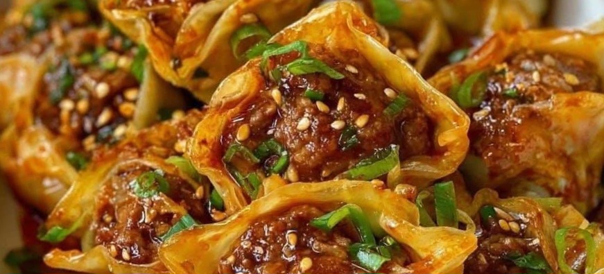 The Ultimate Spicy Beef Wontons Recipe with Sesame and Green OnionIf you’re craving a delicious, savory, and slightly spicy dish, look no further than this spicy beef wontons recipe! These delectable morsels combine juicy ground beef, fresh green onions, and a hint of sesame to create a mouthwatering bite. Whether you’re hosting a dinner party or simply treating yourself to an authentic homemade snack, this recipe is sure to impress.Wontons are a staple in many Asian cuisines, and they can be steamed, boiled, or fried to perfection. In this recipe, we’ll guide you through how to make these spicy beef wontons from scratch, with a flavorful filling and a tasty dipping sauce that will make your taste buds dance.Why You’ll Love This Spicy Beef Wontons RecipePerfect balance of flavors: The blend of spicy, savory, and slightly sweet notes in the beef filling will leave you wanting more.Easy to make: You don’t need to be a professional chef to make these. The process is straightforward and enjoyable!Customizable: Adjust the level of spice to your liking or substitute beef with chicken, pork, or even a vegetarian alternative.Great for meal prep: Make a large batch and freeze some for later use. These wontons can be stored in the freezer and cooked when you’re ready.Ingredients for the Spicy Beef WontonsFor the Wonton Filling:1 lb (450g) ground beef (choose a lean cut for the best texture)1/4 cup finely chopped green onions (scallions)1 tablespoon sesame oil1 tablespoon soy sauce1 tablespoon hoisin sauce1 teaspoon chili paste or sriracha (adjust based on spice preference)2 teaspoons ginger (freshly grated)2 cloves garlic (minced)1 tablespoon oyster sauce1/2 teaspoon five-spice powder (optional, for an added depth of flavor)1/4 teaspoon black pepper1/4 cup water (to moisten the mixture)For the Wonton Wrappers:1 package of square wonton wrappers (store-bought for convenience)For the Dipping Sauce:1 tablespoon soy sauce1 tablespoon rice vinegar1 teaspoon sesame oil1/2 teaspoon chili paste or sriracha1 teaspoon sugar1/2 teaspoon toasted sesame seeds (optional, for added texture)1 teaspoon chopped green onions for garnishInstructions to Make Spicy Beef Wontons1. Prepare the Filling:In a large mixing bowl, combine the ground beef, finely chopped green onions, sesame oil, soy sauce, hoisin sauce, chili paste, grated ginger, minced garlic, oyster sauce, five-spice powder (if using), black pepper, and water.Use your hands or a spoon to thoroughly mix the ingredients. Ensure the mixture is well-combined and slightly sticky, which will help the filling adhere to the wonton wrappers.2. Prepare the Wonton Wrappers:Lay out a few wonton wrappers on a clean, flat surface. Keep the rest of the wrappers covered with a damp cloth to prevent them from drying out.Spoon about one teaspoon of the beef filling into the center of each wonton wrapper. Be sure not to overfill them, as this will make sealing more difficult.Dip your finger in water and run it along the edges of the wonton wrapper. This will help seal the wrapper tightly and prevent the filling from leaking out during cooking.3. Fold the Wontons:Fold each wrapper in half diagonally to form a triangle. Press down the edges to seal them tightly.Next, bring the two corners of the triangle together and pinch them to form a “purse” shape, making sure the edges are sealed well. Repeat with the remaining wonton wrappers and filling.4. Cooking the Wontons:Option 1: Steaming:If you prefer a lighter option, steaming your wontons is the way to go. Arrange the wontons in a bamboo or metal steamer, making sure they are not touching each other.Steam over boiling water for 6-8 minutes or until the filling is cooked through and the wrappers are tender.Option 2: Boiling:Bring a large pot of water to a boil and carefully drop the wontons in batches.Once they float to the top, let them cook for another 2-3 minutes. Remove with a slotted spoon and set aside.Option 3: Frying:Heat about 1 inch of vegetable oil in a large skillet over medium-high heat.Fry the wontons in batches, turning them occasionally, until they are golden brown and crispy, about 3-4 minutes. Drain on paper towels to remove excess oil.5. Make the Dipping Sauce:In a small bowl, combine the soy sauce, rice vinegar, sesame oil, chili paste, and sugar.Stir well until the sugar dissolves completely. Garnish with chopped green onions and sesame seeds, if desired.6. Serve:Arrange the cooked wontons on a serving platter and serve with the dipping sauce on the side. Enjoy them as an appetizer, snack, or even a main dish!Tips for Making the Best Spicy Beef WontonsDon’t overfill the wrappers: Overstuffing your wontons will make them harder to seal and may cause the filling to leak out during cooking.Seal the edges tightly: To avoid any leaks during cooking, be sure to press the edges of the wrappers tightly together when sealing the wontons.Customize the heat: You can adjust the amount of chili paste or sriracha to control the spiciness. For a milder version, reduce the chili paste or omit it altogether.Freeze for later: Make extra wontons and freeze them for later use. To freeze, arrange the wontons in a single layer on a baking sheet and freeze them until firm. Then transfer them to a freezer-safe bag or container. You can steam, boil, or fry them directly from frozen.Nutritional Information (per serving):Calories: 250 kcalFat: 15gCarbohydrates: 15gProtein: 14gFiber: 1gNote: The nutritional values may vary depending on specific ingredients used and portion sizes.Frequently Asked Questions (FAQ)1. Can I make these wontons ahead of time? Yes, you can make the wontons and store them in the refrigerator for up to a day before cooking. Alternatively, you can freeze them for longer storage.2. What can I substitute for ground beef in this recipe? You can easily substitute ground pork, chicken, or turkey for a different flavor. For a vegetarian option, try using tofu or a mix of vegetables.3. How long should I