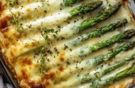 Heat the oven to 400 degrees. – Wash and trim the asparagus, then grease a 9 x 13 baking tray and place them in it. In a skillet, melt the butter over medium heat, then add the soft cheese, heavy whipping cream, chicken broth, garlic powder, paprika, Italian seasoning, salt, and pepper. Stirring constantly until ingredients are well blended.