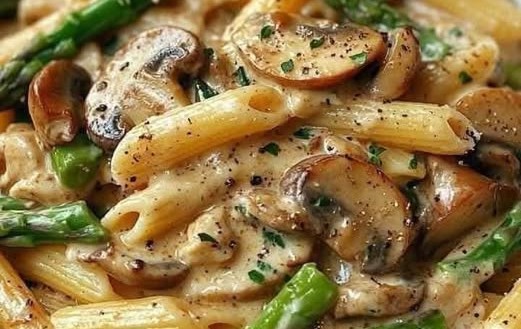 This Creamy Mushroom and Asparagus Chicken Penne is a rich and comforting pasta dish that combines tender chicken, sautéed mushrooms, crisp asparagus, and a velvety Parmesan cream sauce. Perfect for weeknight dinners or special occasions, this dish delivers restaurant-quality flavors with simple, wholesome ingredients.With its creamy texture, savory flavors, and satisfying bite, this dish is sure to become a family favorite. The earthy mushrooms and vibrant asparagus bring a fresh balance to the rich cream sauce, while the Parmesan adds a delicious depth of flavor. Serve this alongside a crisp salad or warm garlic bread for a complete meal.Why You’ll Love This RecipeEasy to Make – Simple steps for a gourmet-style pasta dish.Rich and Flavorful – Creamy sauce infused with garlic, Parmesan, and chicken broth.Perfectly Balanced – A great combination of protein, vegetables, and pasta.Versatile – Works as a quick weeknight dinner or an elegant dish for guests.IngredientsFor the Pasta and Chicken:2 boneless, skinless chicken breasts, thinly sliced8 ounces penne pasta1 tablespoon olive oilSalt and pepper to tasteFor the Creamy Mushroom and Asparagus Sauce:1 cup mushrooms, sliced1 bunch asparagus, trimmed and cut into 1-inch pieces2 cloves garlic, minced1 cup heavy cream½ cup chicken broth½ cup grated Parmesan cheeseFresh parsley for garnish (optional)PreparationStep 1: Cook the PastaBring a large pot of salted water to a boil.Add the penne pasta and cook according to package directions until al dente.Drain the pasta, set aside, and reserve ½ cup of pasta water to adjust the sauce later if needed.Step 2: Cook the ChickenHeat the olive oil in a large skillet over medium heat.Season the sliced chicken breasts with salt and pepper, then add them to the pan.Cook for 5-6 minutes per side, or until golden brown and fully cooked.Transfer the chicken to a plate and set aside.Step 3: Sauté the VegetablesIn the same skillet, add the sliced mushrooms and cook for 3-4 minutes, stirring occasionally.Add the asparagus and minced garlic, then continue to sauté for another 3 minutes, until the asparagus is tender but still slightly crisp.Step 4: Prepare the Creamy SauceReduce the heat to low and pour in the heavy cream and chicken broth.Stir well to combine, making sure to scrape up any browned bits from the bottom of the pan for extra flavor.Add the grated Parmesan cheese and let the sauce simmer for 3-4 minutes until it thickens slightly.If the sauce becomes too thick, stir in a bit of reserved pasta water to loosen it.Step 5: Combine EverythingReturn the cooked chicken to the pan, along with the cooked penne pasta.Toss everything together, ensuring the pasta and chicken are well-coated in the creamy sauce.Cook for an additional 2 minutes, allowing the flavors to meld together.Step 6: Garnish and ServeRemove from heat and garnish with fresh parsley for a burst of color and freshness.Serve hot with extra Parmesan cheese on top, if desired.Tips for the Best Creamy Mushroom and Asparagus Chicken PenneUse Fresh Ingredients – Fresh asparagus and mushrooms add the best texture and flavor.Adjust the Sauce Consistency – If the sauce is too thick, add a little pasta water or more chicken broth. If it’s too thin, let it simmer a bit longer to thicken.Choose the Right Pasta – Penne works well because it holds onto the creamy sauce, but you can also use fettuccine, rigatoni, or farfalle.Add More Flavor – Try adding a pinch of red pepper flakes for some heat or a squeeze of lemon juice for extra brightness.Make it Lighter – Substitute half-and-half or milk instead of heavy cream for a lighter sauce.VariationsAdd More Vegetables – Try adding spinach, sun-dried tomatoes, or bell peppers for extra color and nutrients.Make it Spicy – Add a dash of crushed red pepper flakes for a spicy kick.Swap the Protein – Instead of chicken, use shrimp, salmon, or tofu for a different variation.Use a Different Cheese – Swap Parmesan for Asiago, Gouda, or Pecorino Romano for a unique twist.Serving SuggestionsPair this creamy mushroom and asparagus chicken penne with:Garlic Bread – A crispy, buttery side to soak up the sauce.Fresh Green Salad – A light salad with a lemon vinaigrette balances the richness of the pasta.Roasted Vegetables – Serve with roasted zucchini, carrots, or bell peppers for an extra serving of veggies.Frequently Asked QuestionsCan I make this dish ahead of time?Yes! Cook everything as directed, then store in an airtight container in the refrigerator for up to 3 days. Reheat gently on the stovetop with a splash of chicken broth or cream to refresh the sauce.Can I freeze creamy chicken penne?It’s best to enjoy this dish fresh, but you can freeze leftovers for up to 1 month. Let it cool completely, store in an airtight container, and thaw overnight in the fridge before reheating.How do I reheat leftovers without drying out the sauce?Reheat in a skillet over low heat, adding a splash of cream, broth, or milk to bring back the creamy consistency. Stir gently until warmed through.ConclusionThis Creamy Mushroom and Asparagus Chicken Penne is a rich, satisfying, and easy-to-make dish that brings together the perfect balance of creamy sauce, tender chicken, and fresh vegetables. Whether you’re making it for a quick weeknight dinner or serving guests at a special gathering, this dish is sure to impress.Try it tonight and enjoy a delicious homemade pasta meal that’s both comforting and flavorful!Enjoy !