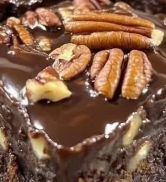 – Remove the brownies from the oven and pour the pecan pie mixture evenly over the top.
