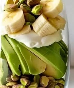 1️⃣ Blend all ingredients – Add banana, avocado, pistachios, yogurt, almond milk, and ice cubes into a blender.