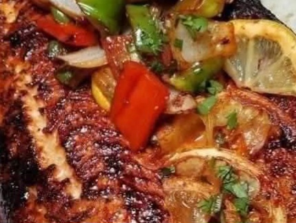 Rinse salmon, dry pat. Pour a spray of oil. Season all sides with Jerk and Lemon Pepper seasoning.